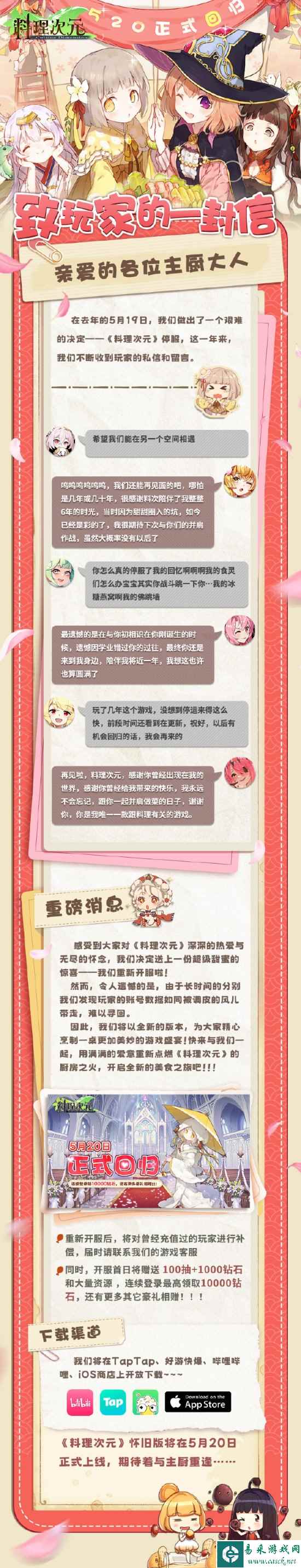 二次元美食手游《料理次元》将于5月20日重新开服,此前于2023年7月19日停服,历经10个月回归。但因停服时间过长,玩家账号数据难以寻回,将会以全新版本的形式回归。