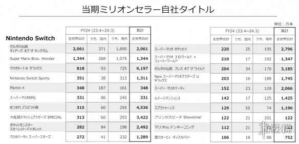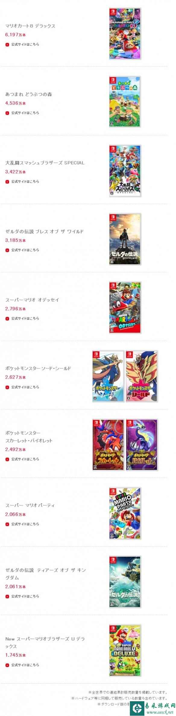 销量 TOP10 的游戏为: 《马力欧卡丁车8 豪华版》:6197万 《集合啦!动物森友会》4536万 《任天堂明星大乱斗 特别版》:3422万 《塞尔达传说 旷野之息》:3185万 《超级马力欧 奥德赛》:2796万 《宝可梦 剑/盾》:2627万 《宝可梦 朱/紫》 2492万 《超级马力欧派对》:2066万 《塞尔达传说 王国之泪》:2061万 《New 超级马力欧兄弟U 豪华版》:1745万