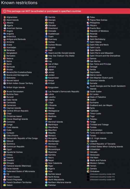 下图就是被禁止购买《对马岛之鬼:导演剪辑版》的国家列表,基本只要PSN无法注册的国家全部都被禁掉了。据推测,这应该是索尼强行推进游戏捆绑PSN计划的延续。