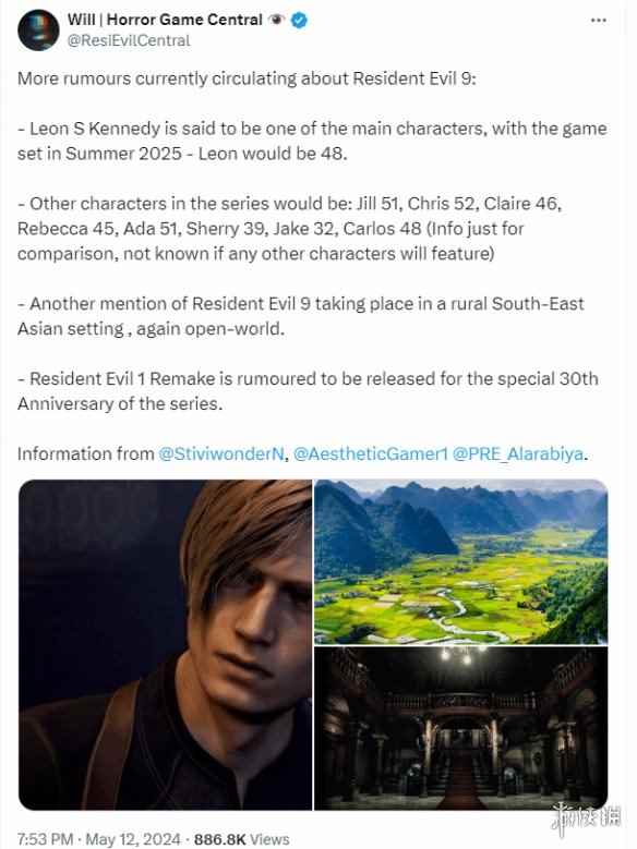 日前,专注于恐怖惊悚游戏的博主@ResiEvilCentral根据之前的爆料,汇总了《生化危机9》的时间背景下,各游戏角色的年龄。