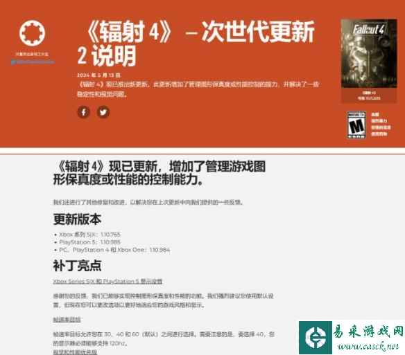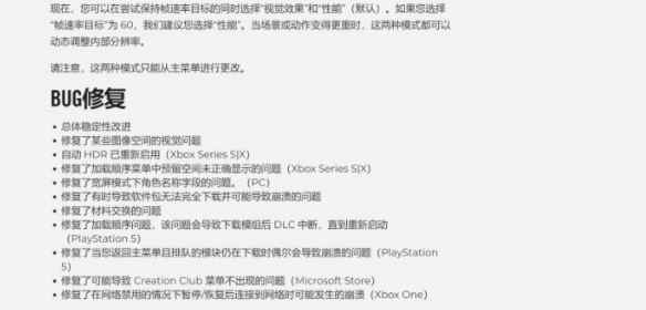 正如上周所承诺的,B社在今天推出了《辐射4》次世代版本第二轮更新,《辐射4》最初于2015年发售。第二轮更新主要为PS5和Xbox Series X|S版本添加了更多微调画质和性能的选项。 更新版本 Xbox Series X|S:1.10.765 PS5:1.10.985 PC、PS4和Xbox One:1.10.984 补丁亮点 Xbox Series X|S和PS5显示设置 由于玩家的反馈,目前玩家可在游戏中控制画面精细度和性能。B社高度推荐玩家采用默认设置运行游戏,但现在玩家可以更改选项以更好地适应自己的游戏风格和显示设备。 帧率目标 帧率目标允许玩家在30/40和60(默认)之间选择。需要指出的是,如果选择40,你的显示设备必须支持120Hz刷新率。 视觉和性能优先级 玩家现在可以在画质和性能(默认》之间选择,同时游戏将尽量保持目标帧率。 如果你选择60帧率目标,B社推荐选择性能模式。 画质模式和性能模式在场景或动作密集时,都会出现内部分辨率动态调整。 请注意:画质模式和性能模式两个模式只能在主菜单处更改 BUG修复 总体稳定性改进 修复了某些图像空间的视觉问题 自动 HDR 已重新启用(Xbox Series S|X) 修复了加载顺序菜单中预留空间未正确显示的问题(Xbox Series S|X) 修复了宽屏模式下角色名称字段的问题。(PC) 修复了有时导致软件包无法完全下载并可能导致崩溃的问题 修复了材料交换的问题 修复了加载顺序问题,该问题会导致下载模组后 DLC 中断,直到重新启动(PlayStation 5) 修复了当您返回主菜单且排队的模块仍在下载时偶尔会导致崩溃的问题(PlayStation 5) 修复了可能导致 Creation Club 菜单不出现的问题(Microsoft Store) 修复了在网络禁用的情况下暂停/恢复后连接到网络时可能发生的崩溃(Xbox One) |