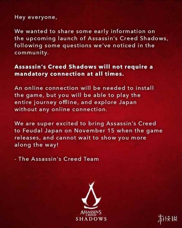 育碧表示,《刺客信条:影》不需要全程强制联网,仅安装游戏时需要联网。即使在离线状态下,玩家也游玩整个旅程。