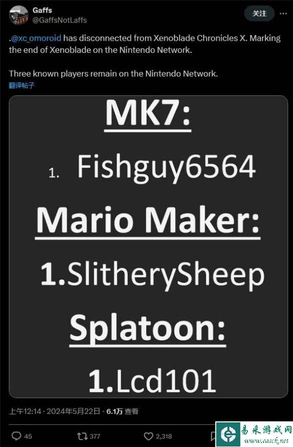 任天堂此前宣布将彻底关闭 3DS 和 WiiU 的线上服务,但一些玩家至今仍在坚持。截至今天(5 月 22 日),依然坚持在服务器上的玩家从 4 名下降至 3 名,因为最后一位仍连接在《异度之刃编年史X》服务器的玩家断开了连接。 这位名叫 XC_omoroid 的玩家在推特上写道:“我刚刚被断连了。令我惊讶的是,我以某种方式打破了 Noble 14 创下的 WiiU 网络代码最差游戏的记录?”值得庆幸的是,他在后续帖子中证实,他们被踢出服务器之前已经通关了所有线上独占内容。 XC_omoroid 自 4 月初服务器关闭以来一直坚持在服务器上。他所提到的“Noble 14”是之前与这群任天堂玩家类似的《光环2》玩家。这 14 名玩家在 10 年前最初的 Xbox Live 服务器宣布关闭后继续游玩多人对战,让服务器保持在线长达数周时间,他们也被后人称为“14圣人”。 任天堂宣布老主机线上服务关闭后,玩家组成了专门的“监管机构”,包括名为“Nintendo Network After Hours”的组织。根据该组织统计,目前仅有 3 名玩家依然连接到已经关闭的服务器,分别是《马里奥赛车7》中的 Fishguy6564,《马里奥制造》的 SlitherySheep 以及《斯普拉遁》玩家 Lcd101。 |