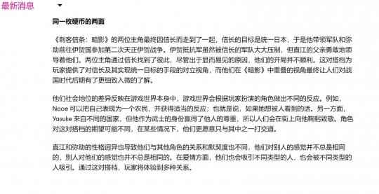 育碧《刺客信条:影》官网刻意提到了双主角的“爱情观”。官网称黑人武士弥助和女主奈绪江“在爱情方面,他们也会吸引不同类型的人,也会被不同类型的人吸引。通过这对搭档,玩家将体验到多种关系”,暗示两大主角都是LGBTQ+。