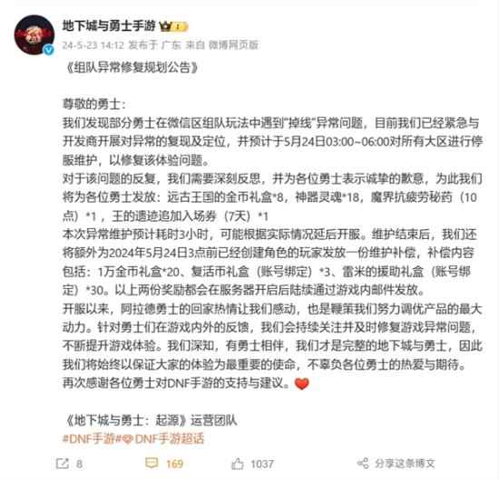 DNF手游太火爆!掉线Bug出后官方致歉:凌晨停服修复!