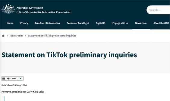 澳大利亚信息专员办公室(OAIC)近日发布声明,称经过初步调查,未发现短视频平台TikTok存在明显违反澳大利亚隐私法的行为,因此决定不进行进一步调查。 OAIC是澳大利亚司法部长领导的独立监管机构,负责隐私保护、信息自由和信息政策等方面的工作,包括开展调查、审查、处理投诉以及提供指导和建议等职能。 2023年底,OAIC对TikTok启动了一项初步调查。调查的起因是TikTok被指控使用名为Pixel的追踪工具,收集用户的网页浏览历史、个人信息等数据,并据此构建用户的电子邮件、电话号码和购物习惯等身份信息。但经过审查,OAIC认为TikTok并未明显违反澳大利亚的隐私法规,因此无需展开更深入的调查。 |