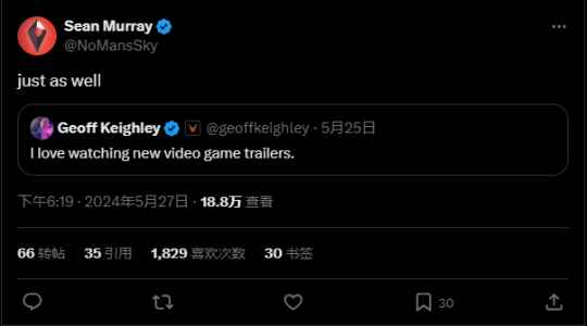 近日TGA主办人Geoff Keighley在推特上表示自己“爱看新游戏的预告片”,而Hello Games的创始人Sean Murray附和道:“俺也一样。”