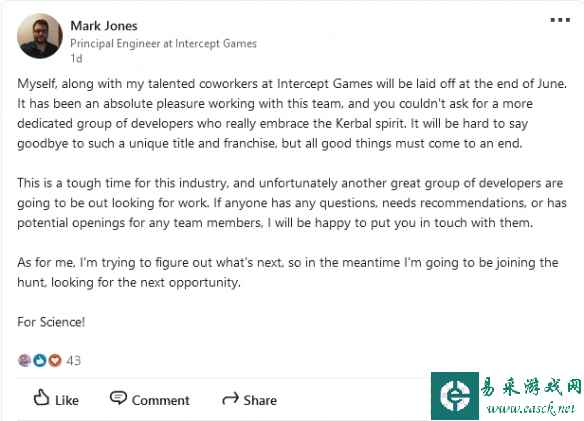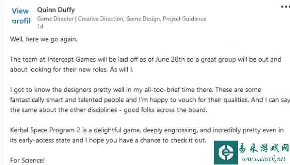 Intercept Games工作室确认将在6月底进行裁员,这一消息最初由彭博社于一个月前报道。最近,据多名员工证实后,此次裁员可能涉及工作室的许多员工,甚至整个团队。 最初的报道源于Take-Two在4月份提交的工人调整和再培训通知(WARN)。通知中提到,Take-Two计划在6月28日前解雇公司西雅图办事处的70名员工,并关闭该工作室。尽管Take-Two最初拒绝置评,但几周后公司CEO Strauss Zelnick回应称,Intercept Games和《像素滑板》开发商Roll7不会被关闭。 然而,Zelnick的回应并没有直接否认报道,也没有澄清这是否意味着这些工作室虽然不会被关闭,但已"名存实亡"作为空壳公司继续存在。 目前可以确认的是,Intercept Games将失去大量、甚至是所有员工。工作室高级设计负责人Quinn Duffy在领英上透露,Intercept Games的团队将于6月28日裁员,因此一支优秀的团队将会出去寻找新职位,他本人也在其中。 软件工程师John Del Valle在自己的帖子中写道,他和Intercept Games的同事都受到了6月底最新裁员的影响。他表示,能够参与如此复杂且令人惊叹的系列工作是他的荣幸,非常感谢有机会在6年期间作为《坎巴拉太空计划1》和《坎巴拉太空计划2》工程团队的一员。 公司的首席工程师Mark Jones也发表帖子,表示自己也会被裁员。他指出,对于这个行业来说,这是一个艰难的时期,不幸的是,又一批优秀的开发者将需要开始寻找工作。 这意味着,几乎工作室所有的重要岗位都被裁员。Take-Two此前的声明表示发行商Private Division将"继续对《坎巴拉太空计划2》进行更新",但没有提到Intercept Games,这加深了工作室可能员工全部被裁的印象。 许多粉丝对于之前的报道反应十分不满,Steam上最近的用户评价为"差评如潮"。国内外的粉丝都对游戏将不再获得更新表达了不满。从玩家评价来看,游戏在发布后仍然存在大量问题没有得到解决。 |