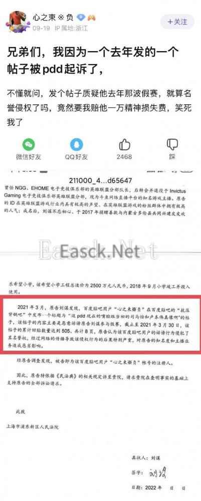 在电竞圈内,类似这样的事件时有发生。英雄联盟主播PDD,2022年就起诉过发帖造谣他打假赛的网友。当时被起诉者,还没有意识到问题的严重性,发布了新的帖子调侃PDD的小题大做。
