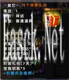 -新服限时福利活动 活动名称:月下弹琴礼包 活动时间:6月7日-6月30日 活动说明:参与新服【月下弹琴】完成手机预约活动,即可在游戏内礼包功能激活,领取“月下弹琴礼包”奖励。 活动奖励: