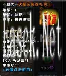 活动名称:伏魔玩家群礼包 活动时间:6月7日-6月30日 活动说明:加入【伏魔】官网玩家交流群,即可规定时间内寻找客服【柠檬七喜】提供账号信息,领取“伏魔玩家群礼包”奖励。 活动奖励: