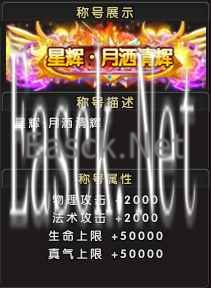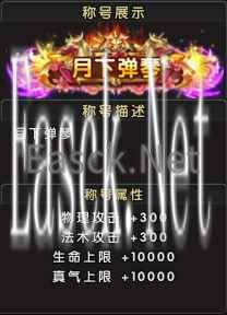 称号名称:月下弹琴 称号属性:物理攻击+300,法术攻击+300,生命上限+10000,真气上限+10000; 预约地址:点击参与新服【月下弹琴】手机预约活动 参与新服战力排行榜活动,达成条件可解锁限定“星辉”系列称号
