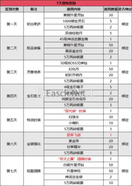 称号名称:星辉 · 月洒清辉 称号属性:物理攻击+2000,法术攻击+2000,生命上限+50000,真气上限+50000; -新服活动内容前瞻 活动名称:7日登陆奖励 活动说明:玩家在线完成7日的在线签到,即可领取前所未有的豪华奖励。神器,BOSS,宝石,时装,坐骑,翅膀道具应有尽有,这也太爽了吧! 活动奖励: