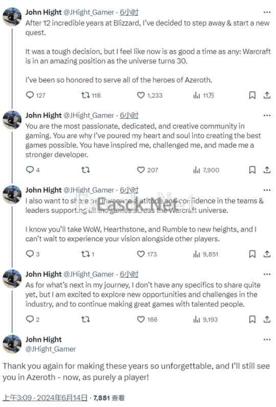 6月14日,魔兽系列高级副总裁兼总经理John Hight在X上发文宣布将离开暴雪,截止到离职前,John Hight已经在暴雪工作了12年,接下来他将开始一段新的征程。