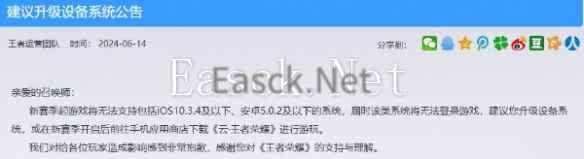 公告称,届时该类系统将无法登录游戏,建议玩家升级设备系统,或在新赛季开启后前往手机应用商店下载《云・王者荣耀》进行游玩。