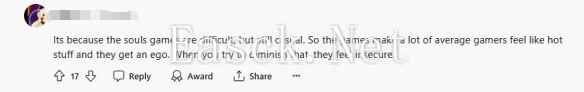 针对他的问题,网友的回复可谓极具攻击性:“‘魂’系列的难度表面看上去非常高,但只需要稍加练习就可以熟练起来。因此,这些游戏能让很多普通玩家感觉自己很厉害,满足他们的虚荣心。当你试图削弱这种自负感时,他们就会急眼。”