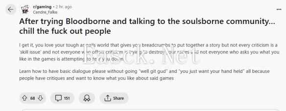 今日,Re ddit上一篇有关“魂”系列游戏的讨论贴受到了广泛关注。博主表示:那些遇到反对意见就无脑攻击他人的极端粉丝们破坏了正常的游戏讨论环境。“我只是对你喜欢的游戏提出一些批评,并没有想让它死。”