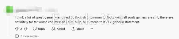 评论区的各位纷纷表示赞同。有网友同样抱怨自己所遇到的情况:“不知道从什么时候开始,人们开始把喜欢‘魂系列’游戏当做了个性。”“他们不让你对游戏进行批评,这类游戏果然还是保持小众比较好。”