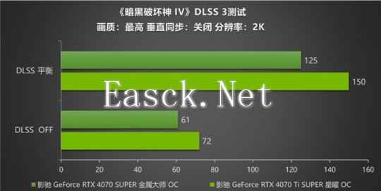 对于追求极致画质的玩家而言,4K分辨率将是不二之选。而影驰 GeForce RTX 4070 SUPER系列GPU通过实际表现向玩家证明,通过自身优异的性能和DLSS 3技术的加持,足以让玩家在4K分辨率下流畅游玩《暗黑破坏神 IV》第四赛季!在DLSS 3模式下,影驰 GeForce RTX 4070 SUPER 金属大师 OC的帧数达到了89帧,影驰 GeForce RTX 4070 Ti SUPER 星曜 OC则是依旧拥有突破百帧的优异表现,平均帧达到111帧。 DLSS对比画面