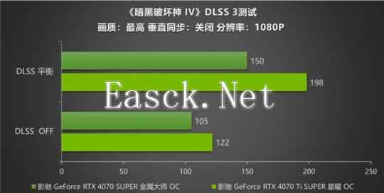 官方宣布全新DLC“憎恨之躯”将于10月8日正式发布,且目前已经开启预售!已知一大亮点,该DLC新增全新职业——魂灵师,这个职业可以使用强大的自然力量和,让玩家体验独特的战斗风格。其二,游戏的地图也将进一步进行扩展,玩家可以深入到纳汉图的丛林和特干泽荒漠,探索更多的区域,以及面对更加凶狠的敌人。最后,游戏中还将加入全新佣兵和独特的战斗技能,相信DLC“憎恨之躯”将会给与玩家们更加新鲜且丰富有趣的游戏体验。 游戏实测 在本次《暗黑破坏神 IV》第四赛季游戏测试中,影驰为玩家提供了两款不同型号GPU下的性能实测数据——影驰 GeForce RTX 4070 SUPER 金属大师 OC和影驰 GeForce RTX 4070 Ti SUPER 星曜 OC。为了玩家能最直观的了解该游戏对于硬件配置的要求,测试中将全程采用最高画质设置,保持开启全景光追技术。为玩家提供1080P、2K和4K三个分辨率下的测试数据,以及DLSS 3技术开启前后的游戏帧数对比。 1080P