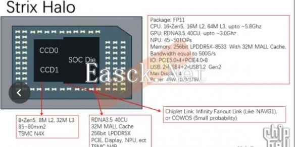 Stirx Halo将会采用类似桌面处理器的chiplet设计,包含两颗CCD、一颗SoC Die,最多16个CPU核心、40个GPU核心,图形性能有说法声称能媲美移动版RTX 4070,但此处存疑。 |