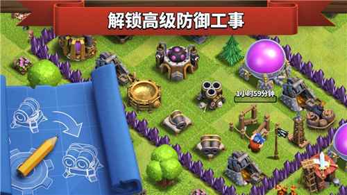 新建筑:轻松打造完美防御! 在第二大本营中,将会有多种有趣的新建筑,来帮助玩家守卫家园。这其中不仅包括威力无穷的撼地巨石,分散敌军的弹射陷阱,还有给玩家带来巨大收益的宝石矿井和时光钟楼。宝石矿井每隔一段时间便会产出宝石供玩家收集,而时光钟楼会加速建筑大师基地中的所有项目。在全新建筑的帮助下,玩家将轻松打造第二大本营,获得高额奖励!