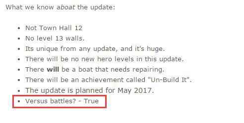 此次更新,大家应该都知道具体是什么内容了吧,不知道我这边再重新翻译一下官方的提示更新信息: 1、没有13级墙 2、没有12大本营 3、此次更新版本内容超大 4、没有增加英雄等级上限 5、有一艘船需要修理 6、新增一个成就“不建造”(右先生:应该是这个意思,具体看更新后叫什么) 7、版本更新在2017年5月份 8、对战模式?——是的