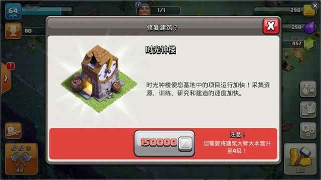 对抗赛结算界面 七、新建筑拥有各种多样功能 除了新兵种与新模式之外,当然少不了新建筑,除了我们熟知的几种建筑之外,新世界还有这样一些我们从没见过的建筑! 时光钟楼:在达到4级大本营并将其修复之后,可以每8小时提供免费全建筑加速10倍的效果持续10-20分钟。钟楼的加速功能不仅可以提升建筑物的升级速度。而且可以减免玩家等待兵种训练的时间,在短时间内进行多次进攻。