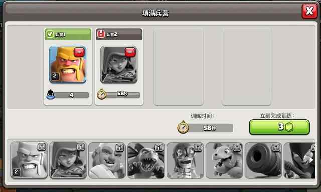 新世界的建筑大师 四、新的兵种建造机制 1、在第二大本营中,一个兵营只能容纳一种部队。 2、当有多个兵营的时候可以训练多种部队。 3、升级兵种可提升单个兵营容纳该兵种的数量,建造更多的兵营可以是兵种搭配更为丰富。 4、训练兵种不再需要使用资源,并且在设定该兵营的训练兵种之后,一旦兵种被消耗会自动建造。 5、第二大本营中并没有“法术”存在,所以进攻时更强调兵种之间的搭配。 下图为兵营1训练野蛮人,兵营2训练弓箭手。