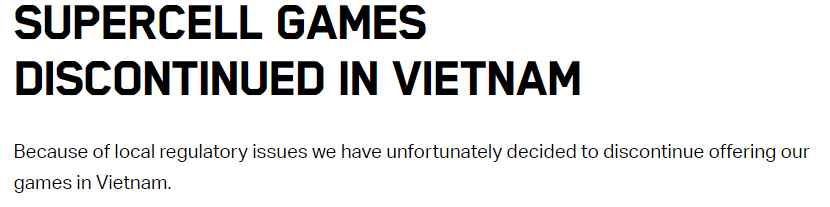 SuperCell官方表示,虽然他们积极地与当地的合作伙伴以及政府展开对话,但并没有得出一个长期有效的解决方案,因此SuperCell决定暂时退出越南市场。同时SuperCell也说到希望这不是最后的再见,他们将努力寻找合适的方式以继续为越南的玩家们提供服务。