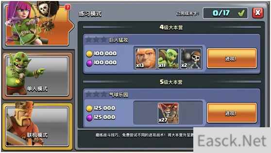 Q:进攻菜单里多出来一个练习模式,那是什么? A:练习模式一共包括17个训练关卡,随着大本营等级的提高逐步解锁,攻破关卡便可以获得对应奖励。