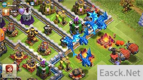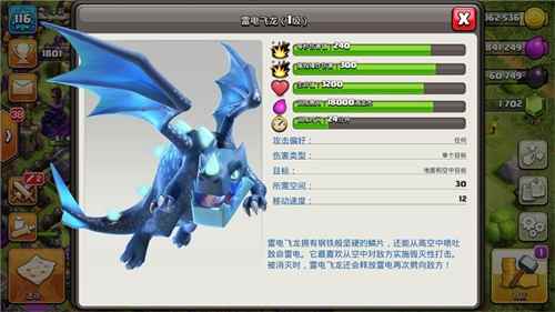 重要指数:★★★★☆ 兵种玩法:新大本营的提升怎么少得了新兵种呢?当我们达到11级别时即可解锁全新的兵种‘雷电飞龙’,这个兵种可以理解为‘飞龙’的加强版,不过自身是属性电系伤害,且各方面都属性都会偏高,是一个大型的兵种。攻击上也具备特殊的形式,属于跳跃雷电伤害,当集中附近的敌军后,还可以对最多攻击4个不同的防御建筑和部队造成伤害,死亡后还具有爆炸输出!