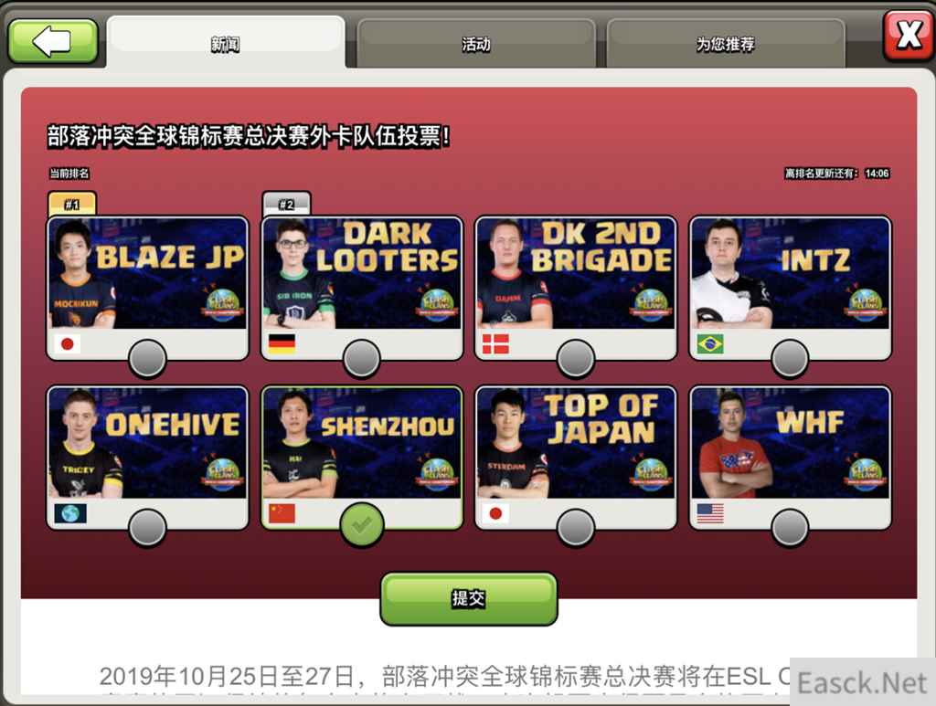 此外,还有外卡席位可以由玩家投票产生。大家快来游戏内给另一支中国部落ShenZhou投票吧!让我们期待德国汉堡总决赛,两支中国部落共同向着全球锦标赛的冠军荣誉冲刺!