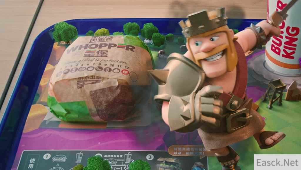 这款魔法餐垫,呈现了一个由“汉堡基座”和“可乐圣水”构成的部落冲突世界。当你用AR扫描餐垫后,就可以看到野蛮人之王带领野蛮人小队,在你布好的快餐迷阵中四处奔走,从兵营向汉堡王基座进军的英勇模样。是调戏一番还是暗中观察?野蛮人之王的这趟征途还暗藏着哪些互动机关?