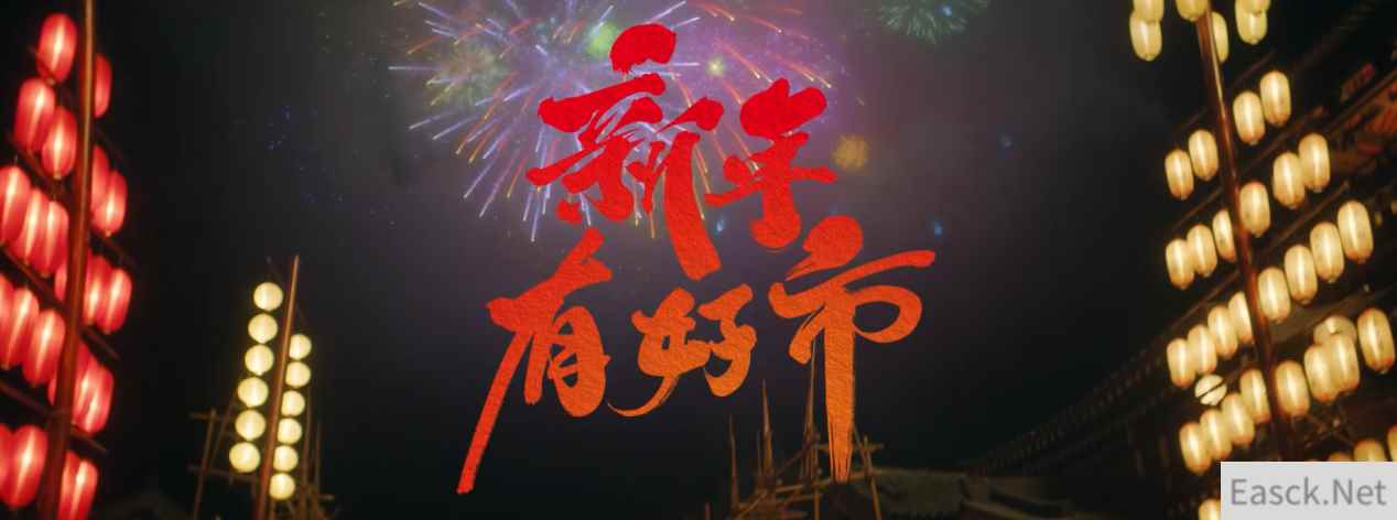 随着天空也绽放美丽的烟花,王承渲小姐姐抬头望向天空出现一句话“新年有好市”。