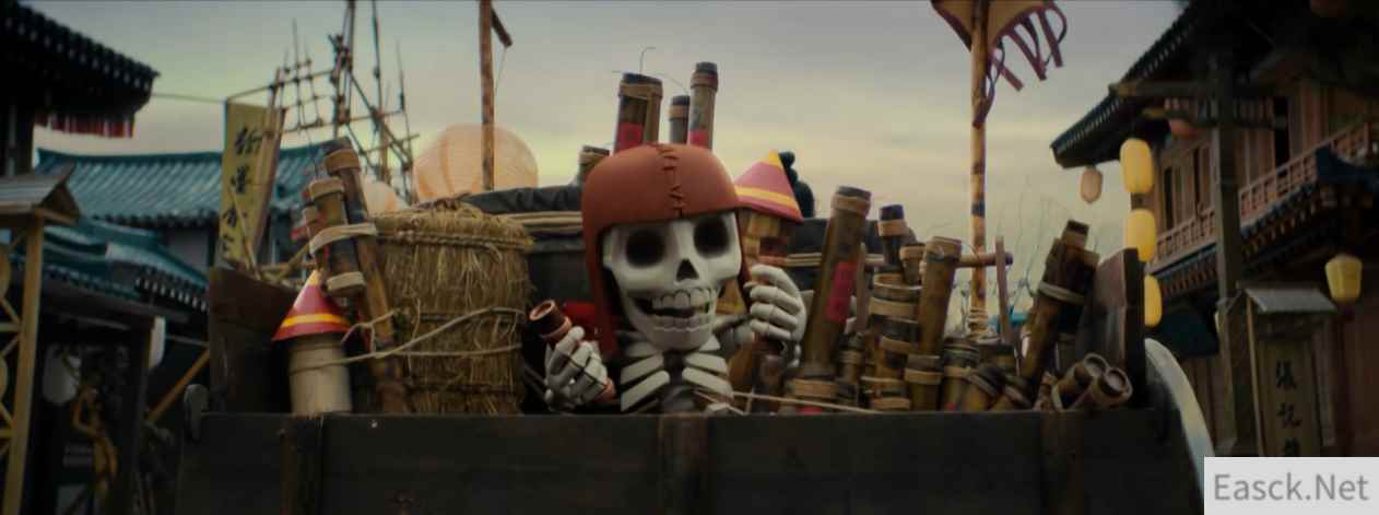 镜头一转随着孔明灯的放出,我们发现集市开始了各种表演。野蛮人为了追逐不安分的炸弹人,抢过了锣鼓想吸引马车的注意。在热闹的歌舞声中,野蛮人并没有成功拦截下马车,随着路边突然出现的巨人惊吓到了马匹,烟花桶和炸弹人同时落地并且炸弹桶被点燃,情况十分危急。