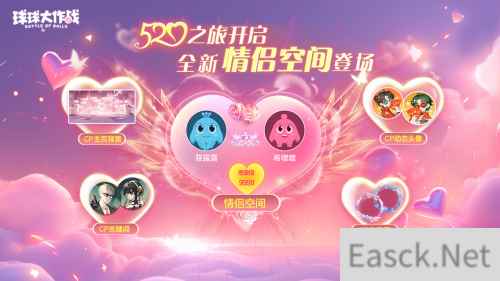 开通双人CP通行证!解锁绝美CP皮肤 开通520之旅,即可解锁专属情侣空间,领取全新CP称号、个人主页背景和海量极品皮肤宝箱、心动全屏盲盒、金塔步数,完成亲密任务还可领取亲密称号「神仙伴侣」和专属留言框。