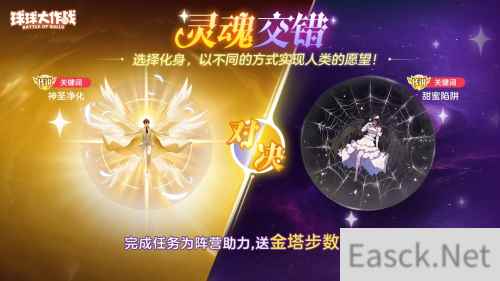 「灵魂交错」任务开启,参与赢取海量道具 「灵魂交错」对抗任务开启,圆梦天使和代偿恶魔两大阵营正展开一场激烈的较量,而你的选择将左右这场角逐的胜负。 完成系列任务支持所在阵营,将获得珍贵的道具奖励和免费金塔步数。获胜方所有球宝将获得诸神珍宝箱*3、超大宝箱钥匙*1、炫彩棒棒糖*15作为额外奖励。活动期间球宝可以通过最低3元的价格获得传说关键词「神圣净化」&传说关键词「甜蜜陷阱」!
