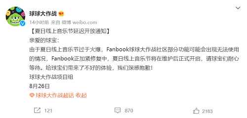 值得注意的是,这次音乐节原定是在8月26日举办,但因为当时涌入活动的玩家过多,导致Fanbook球宝社区的服务器卡顿、部分功能无法使用,音乐节也不得不延期至8月27日;在延期并对服务器扩容后,仍有不少玩家表示无法进入活动……显然,官方低估了玩家们的热情。