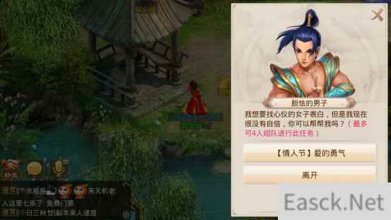 帮“NPC”追妹子,一段独特的追爱之旅即将启程!揽仙镇外出现一位“胆怯的男子”,缺乏自信,希望大家能帮其准备情人节礼物。道友需经历一系列交涉甚至战斗,才会凑齐“最美的花”、“最美的玉佩”和“家传的斩妖剑”,并帮助“胆怯的男子”锻炼胆识,使其鼓起勇气,向心仪女子表白。 不知道各位单身的道友,有没有从这个任务中学到几手?希望单身的道友们都能找到爱的勇气,大胆的向心仪的对象表白心意,收获一份美满的爱情。
