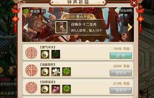 30级以上的道友可以与四海升平钟NPC对话,获得【春节】钟声祈福任务。大年初一19:00-11:00期间,每个整点及之后一小时内都可以敲响一次钟声以获得祝福,更有机会获得变异宠、6阶坐骑、神兽等超级大奖! 活动二:喜填春联