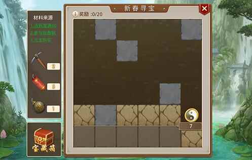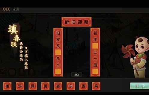 道友找到黄仨儿,他将会随机为你奉上一对缺字的春联,上联和下联中各有两个字缺失,需要你在选项中选择正确的文字填入其中,回答正确即有经验、道行奖励。 活动三:新春寻宝