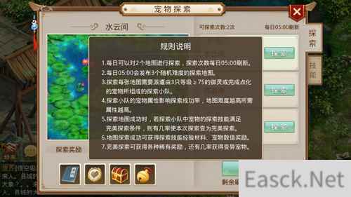 宠物探索是个每日活动,在揽仙镇的莲花姑娘处接取,每天可完成两次。每日05:00会刷新探索次数,并发布3个随机难度的地图。每张地图需要派遣由3只≥75级的宠物所组成的探索小队。