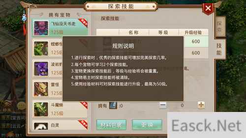 选择好派遣宠物以后就结束吗?还没有,千万不要忘记替它们选择探索技能。不同的探索技能对应不同的能力,技能越高越容易达成完美探索,奖励自然也会越高。并且,每次探索都会获得一定的经验材料,可用于提升探索技能等级。