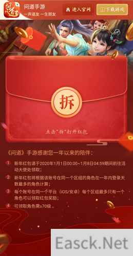 今天就是2019年的最后一天了,按照往年的惯例,《问道》手游将会在年底为道友们发放“年终奖”~今年当然也不例外,只要你的游戏角色≥70级,就能在2020年1月1日拿到专属于你的新年红包!