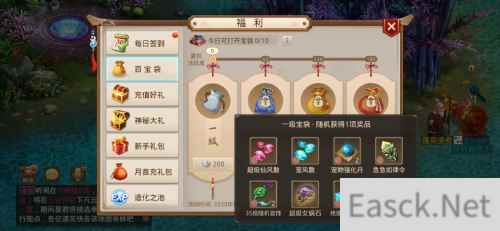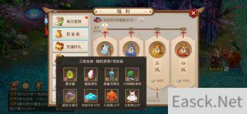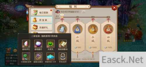 三级宝袋 售价:1000银元宝 解锁条件:活跃度≥120 开启可获得以下奖励中随机一项:黄水晶、超级灵石、装备共鸣石、50级随机首饰、超级女娲石、绝版时装·90天、九尾狐公仔、北极熊公仔