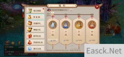 四级宝袋 价格:1500银元宝 解锁条件:累计活跃度≥180 开启可获得以下奖励中随机一项:超级粉水晶、超级绿水晶、宠物顿悟丹、羽化丹、60级随机首饰、天倾石、超级女娲石、绝版时装·永久、召唤令·十二生肖、召唤令·上古神兽、太极熊公仔、混元金斗摆件