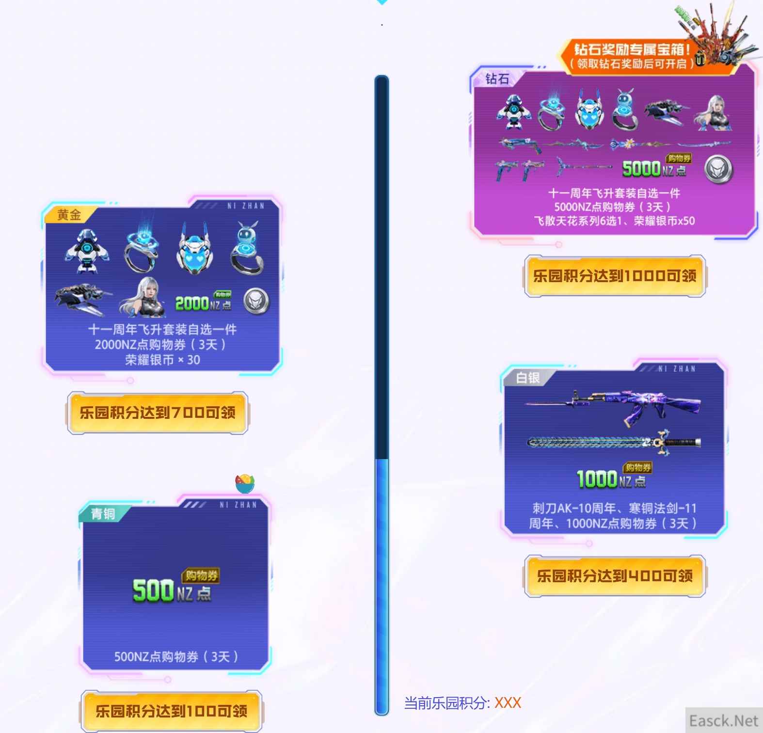 【乐园积分获取扩充,钻石宝箱领取开放】 活动时间:12月14日-1月8日 玩法:乐园积分获取已经全面开放,十一周年飞升套装将开放自选领取!乐园庆典第三期增加了总计可获得400积分的任务,结合前两期任务可积攒到最多1000乐园积分,根据积攒乐园积分的数量可获得青铜奖励,白银奖励,黄金奖励,钻石奖励,到达钻石奖励之后还有额外神秘大礼相送。