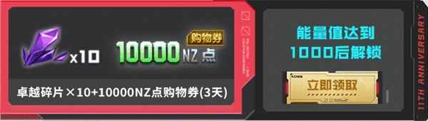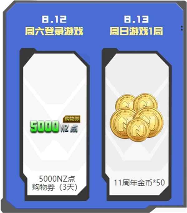 在本周六8月12日,各位玩家登录逆战,即可直接在游戏内活动中心领取5000 NZ点购物券。 本周日8月13日,游戏一局,还可以领取11周年金币x50个 8月10日-8月13日,各位玩家登录游戏,就能在游戏内活动中心领取卓越碎片x10! 8月14日-8月27日,连续两周内,只要每周累计登录天数,还能再领卓越碎片x20,共计30连抽的卓越碎片等你领取!