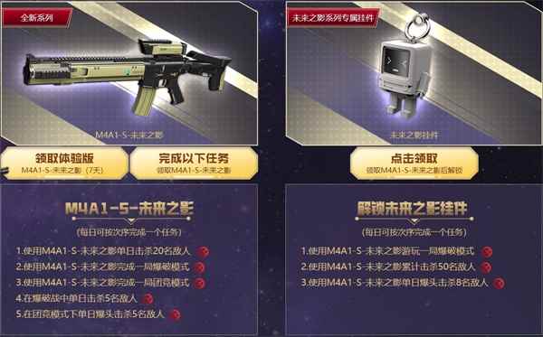 8月11日-9月11日,各位玩家可以领取并装备体验版M4A1-S-未来之影,挑战专属任务,完成五项挑战,即可领取永久版PVP全新系列M4A1-S-未来之影。领取后还可解锁未来之影系列专属挂件,继续挑战3项挂件任务,完成后可以直接领取呆萌的未来之影挂件。